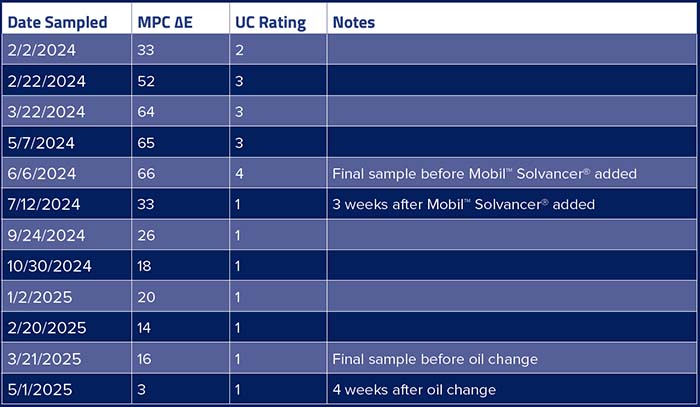 Analysis revealed high varnish levels indicated by elevated Membrane Patch Colorimetry (MPC) values (66dE). The mill implemented a 5% treatment rate of Mobil Solvancer (approximately 40 drums) combined with enhanced kidney-loop filtration.